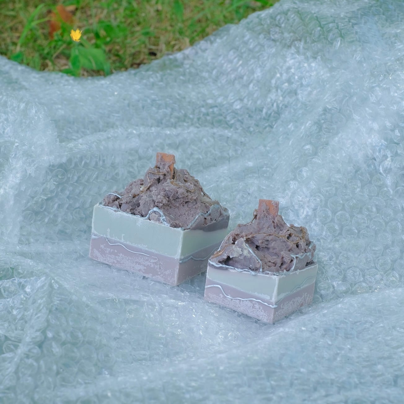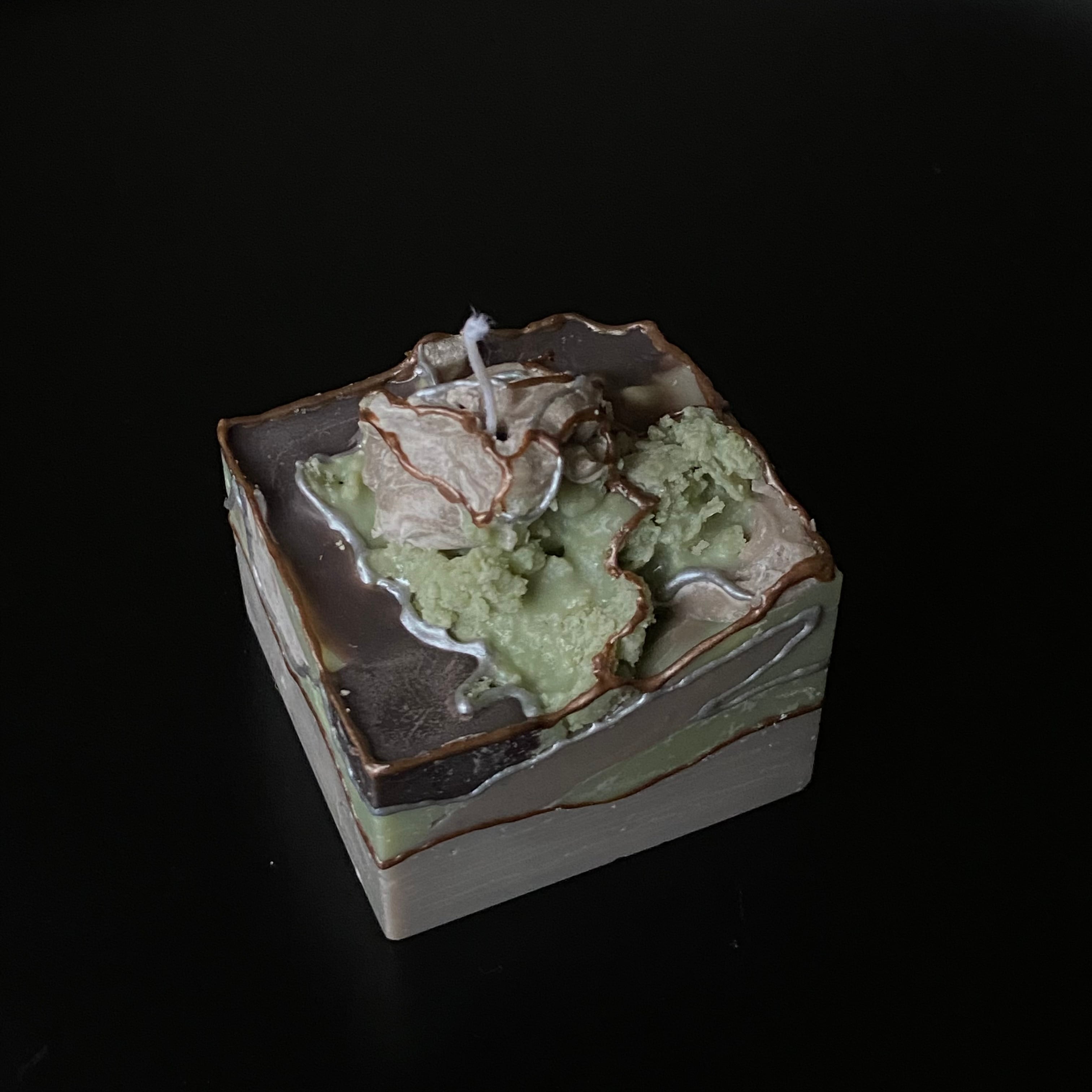 山岳を抽象的に表現し、火を灯すと山肌や地層が溶け合い、色彩豊かなロウが大地を描き出します。燃え進むたびに形が変わり、あなただけの景色へと育つキャンドル。